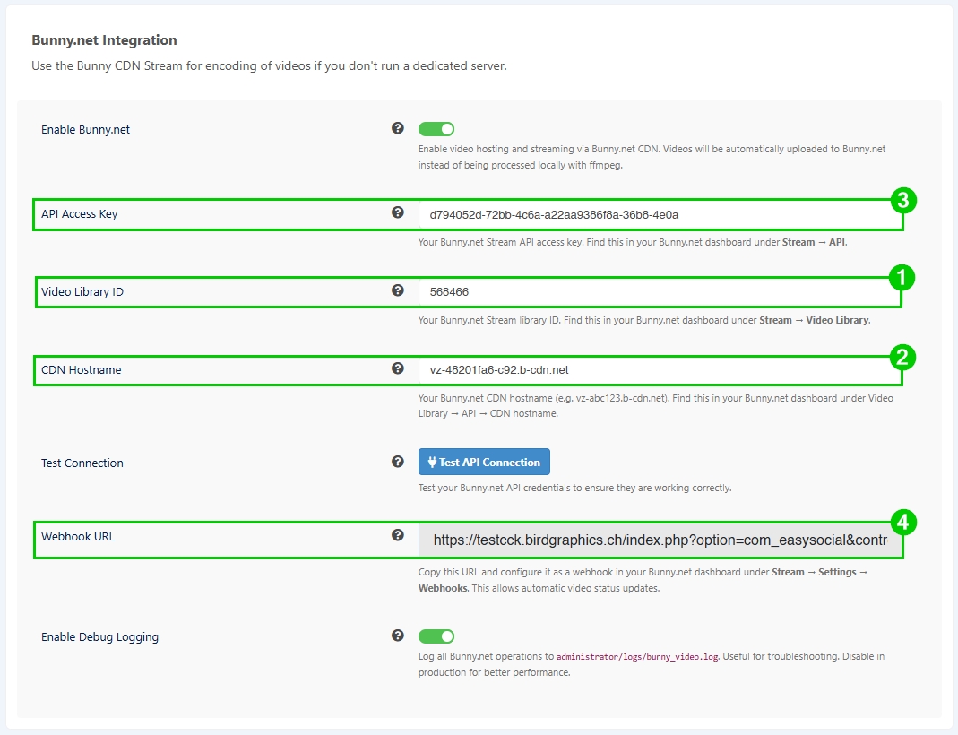 Die Video Library ID, der API Access Key und der CDN Hostname werden von Bunny CDN generiert und müssen in die EasySocial Konfiguration übernommen werden. Die Webhook URL wird in EasySocial generiert und muss ins Bunny CDN übernommen werden.